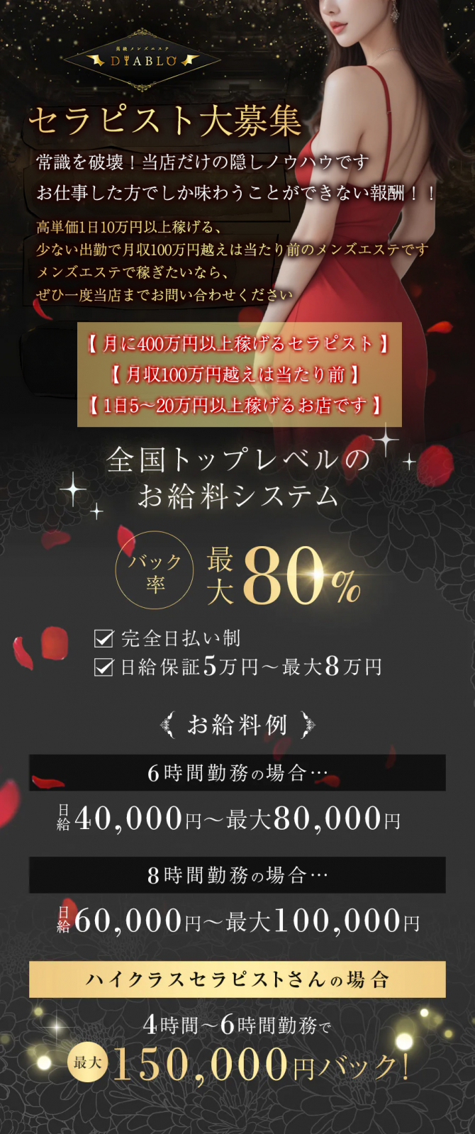| 給与 | 報酬5万円~8万円/日 給与 ・コース料金の50%以上(※ご経験により応相談) ・指名・オプションは100%のフルバック! ・全額日払いでお持ち帰り可能です! 計算してもらえれば圧倒的に稼げる理由がわかります! |