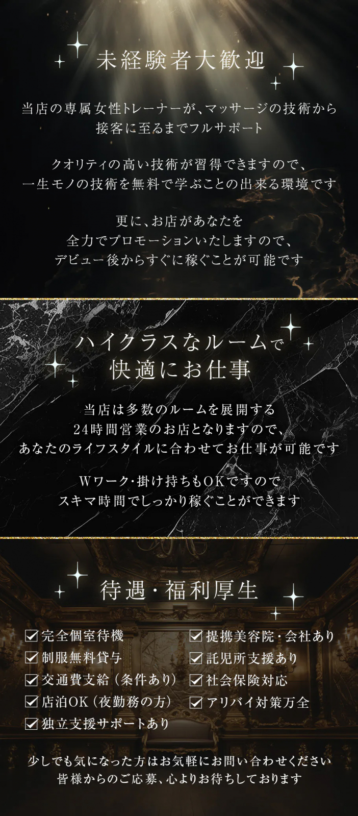 | 待遇 | お給料は料金の50%以上バック(※ご経験によって応相談) ・指名・オプションは100%のフルバック ・全額現金当日のお支払い ・制服貸与あり ・ボタニスト等のリッチなシャンプー&トリートメント完備 ・サロニアのコテ完備 ・Wi-Fi完備 ・電子レンジ完備 ・綺麗な高級マンション ・掛け持ち ・Wワーク大歓迎 ・お引越し斡旋可 ・勤務先対策 ・アリバイ対策 ・マイナンバー対策 その他、生理用品などアメニティ完備してます! その他詳しくはお問い合わせください。 |